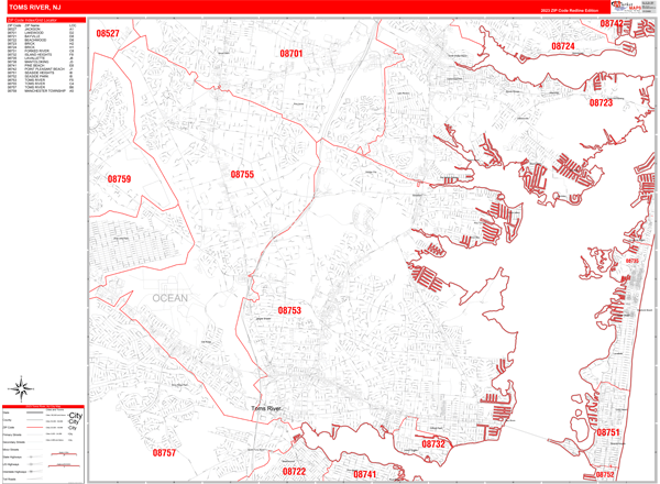 Toms River New Jersey Zip Code Wall Map (Red Line Style) by